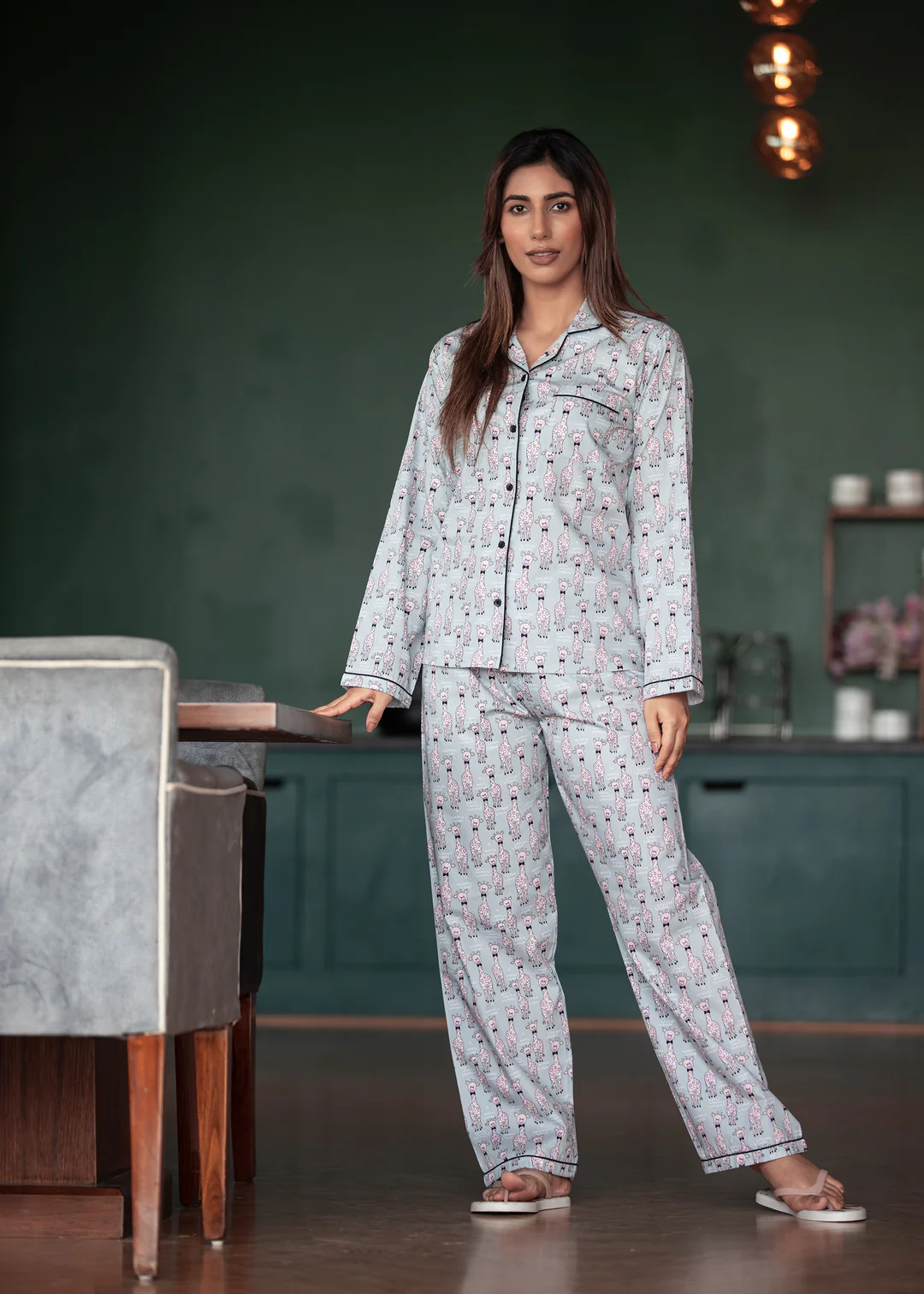 Comfortable women’s full-sleeve night dress featuring a soft shirt and matching pants. Designed for cozy sleep, all-night comfort, and stylish home wear.